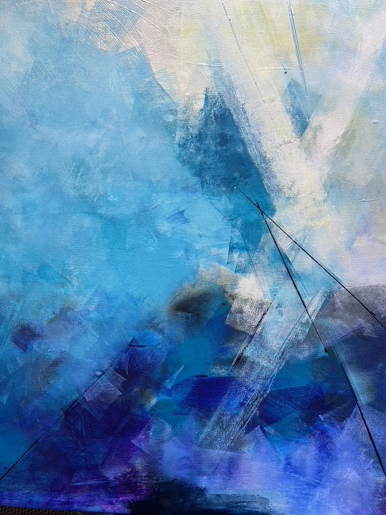 Blau und weiß - Himmel, vielleicht auch Meer und Licht. Strahlen, die das tiefe Blau durchbrechen. Der Blick wird gehalten, sucht und verbindet sich mit der Tiefe. Das Bild zeigt Richtungen und gibt gleichermaßen Ruhe, Balance und Energie.