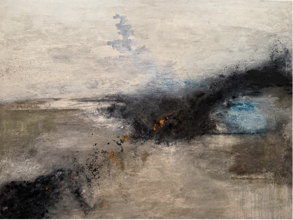 Das großformatige Werk zeigt eine horizontale, abstrakte Komposition in erdigen Grau-, Beige- und Schwarztönen. Die Oberfläche ist vielschichtig aufgebaut und von rauen Texturen, Verwischungen und Abrieb geprägt. Dunkle, nahezu rußartige Farbverdichtungen durchziehen das Bild diagonal und wirken wie Spuren einer Bewegung oder eines Ereignisses.