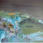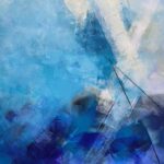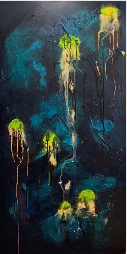 Das hochformatige Werk zeigt eine abstrakte Komposition auf dunklem, tiefblauem Grund. Leuchtende grüne Farbakzente und helle, lineare Spuren durchziehen die Bildfläche vertikal und erzeugen den Eindruck von aufsteigender Energie und Bewegung. Strukturierte Schichtungen und Risse verleihen der Oberfläche Tiefe und Materialität.